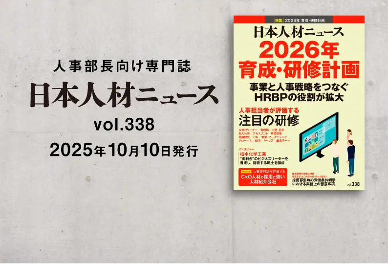 特集では事業と人事戦略をつなぐHRBPの役割に関する取材記事や、人事担当者が評価する注目の研修を取り上げています。また、インタビューでは積水化学工業のビジネスリーダー育成について、労働法解説では採用募集時の労働条件明示における実務上の留意事項について掲載しています。