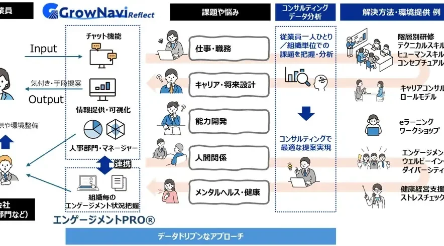 AIが従業員の伴走者として寄り添い、本音を引き出しながら問いかけや示唆を通じて内省を促すことで、従業員が自ら気づき、考え、行動へ移す力を育む。対話データを分析・可視化することで、上長は部下の状況や課題を早期に把握し、的確な支援や対話につなげ、人事部門は組織ごとの傾向を基に人事施策を設計できる。経営層は、人的資本開示のエビデンスとして活用でき、従業員・組織・経営が一体となって成長する仕組みを実現する。