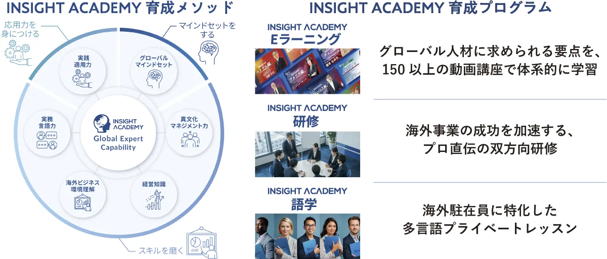 インサイトアカデミーは、1000社以上の海外事業展開を支援するコンサルティング会社サイエストのグループ会社で、グローバルビジネスの成功に必要な人材について熟知している。実践経験豊富な講師によるサポートに対する評価は高く、顧客企業が必要とする人材や国別にカスタマイズされたEラーニング、研修、語学などのプログラムは高い満足度を実現しており、グローバル人材育成を加速させたい企業のパートナーとなっている。