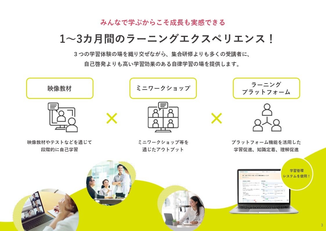 - 集合研修よりも多くの受講者に、eラーニングよりも高い学習効果をもたらす、現場実践力が身に付く教育施策を、低価格・少工数で実現!