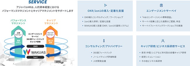 株式会社アジャイルHRは、新時代のパフォーマンスマネジメントとキャリアマネジメントの実現を支援する会社です。OKRと1on1をサポートするクラウドサービス「WAKUAS」を中軸に、OKRや1on1、キャリア開発などに関する研修サービス、360度フィードバック、エンゲージメントサーベイの導入支援、人事制度改革のコンサルティングサービスを提供しています。