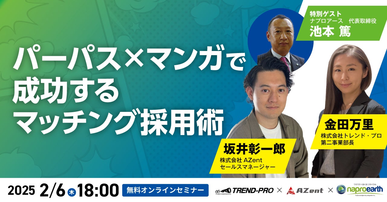 株式会社トレンド・プロ(本社:東京都港区、代表取締役社長:岡崎寛之、以下トレンド・プロ)は、株式会社AZent(本社:東京都港区、代表取締役:柳沼圭佑、以下AZent)と共同で、パーパスで見つける真のマッチング採用術を解説するオンラインセミナーを2/6(木)18時から開催いたします。