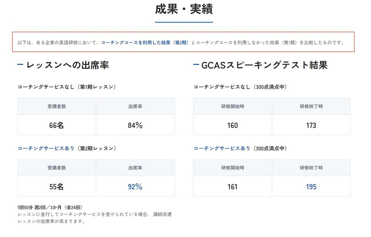 3ヶ月のコーチングを導入した企業では、受講者の中でアンケートに回答した54名のうち、53名がコーチングセッションが自身の英語学習に「役に立った」と回答しました。また、ビジネスで求められる実践的英語力を測定する「GCAS」を受験した方の94%が、コーチング導入前の研修(第1期)と導入後の研修(第2期)の受験結果を比較したところ、スコアが向上したことが確認されました。さらに、導入前の出席率は84%でしたが、コーチングを取り入れたことで92%にまで向上しました。