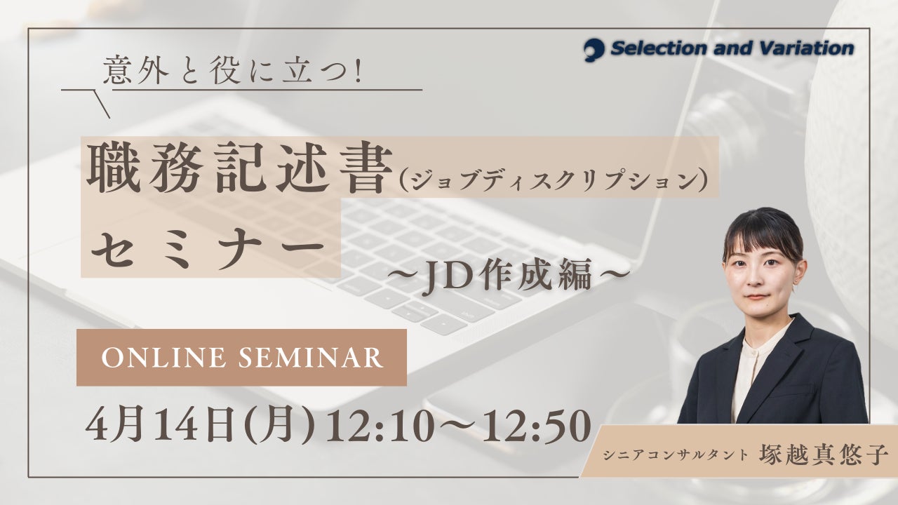 組織・人事コンサルティングファームであるセレクションアンドバリエーション株式会社(以下、当社、東京都千代田区丸の内、大阪市西区、名古屋市西区 / 代表取締役社長:平康慶浩/ URL:https://sele-vari.co.jp/ )は『意外と役に立つ職務記述書(ジョブディスクリプション)セミナー~JD作成編~』を2025年4月14日(月)12:10〜12:50に開催することをお知らせいたします。