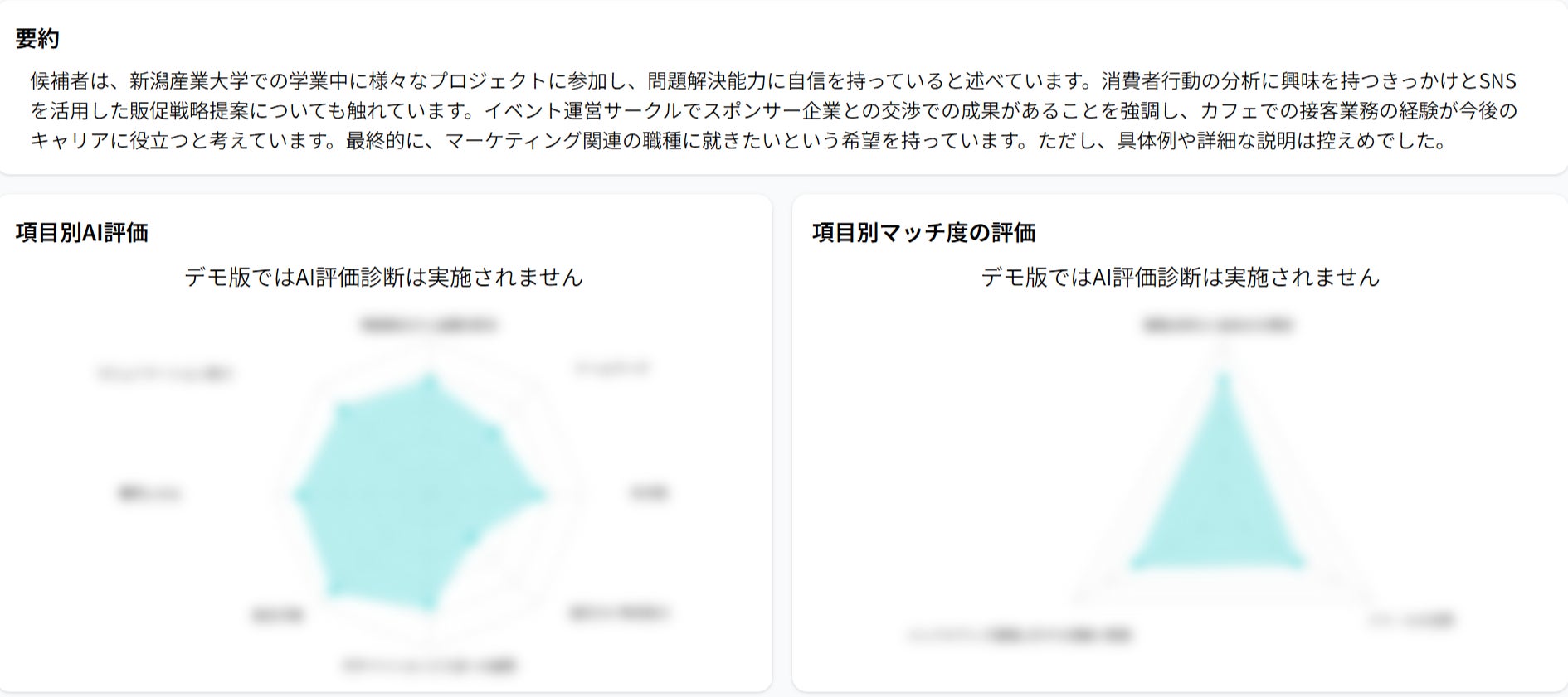 評価シートは「動画のレコード」「全体の要約」「AIによる分析解説」「項目別マッチ度の評価」「項目別AI評価」「質問と回答の要約」で構成され、採用担当者が面接合否を決める材料として活用できるようになっています。このうち、「AIによる分析解説」「項目別マッチ度の評価」「項目別AI評価」などは、製品版でリリースする予定です。
