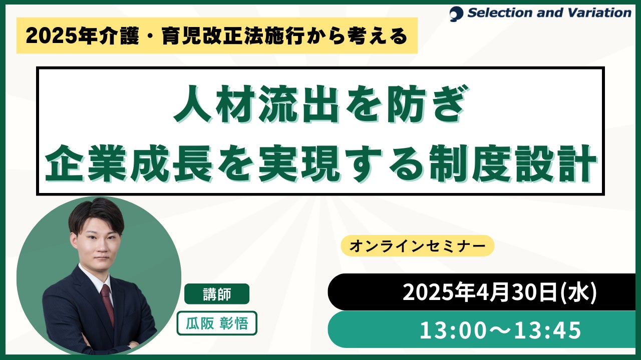組織・人事コンサルティングファームであるセレクションアンドバリエーション株式会社(以下、当社、東京都千代田区丸の内、大阪市西区、名古屋市西区 / 代表取締役社長:平康慶浩/ URL:https://sele-vari.co.jp/ )は『2025年介護・育児改正法施行から考える、人材流出を防ぎ、企業成長を実現する制度設計』セミナーを2025年4月30日(水)13:00〜13:45に開催することをお知らせいたします。