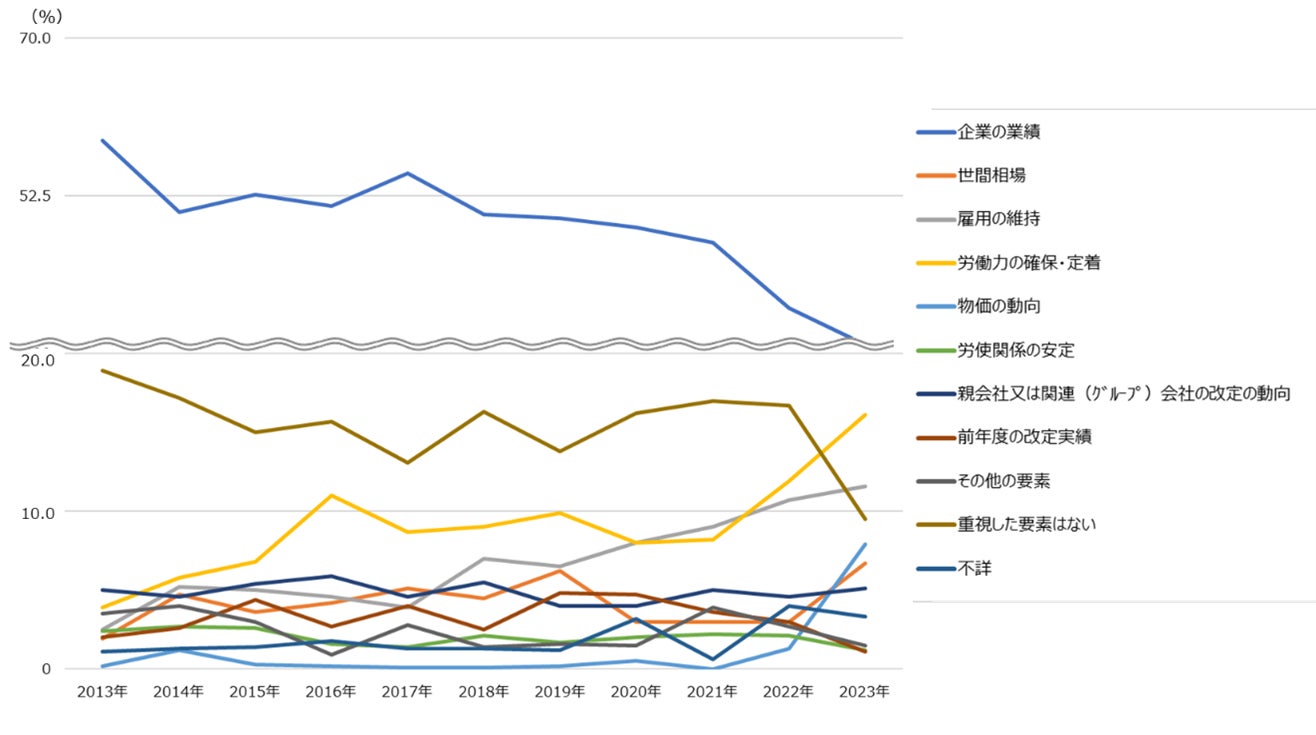 一方、近年割合が高まっている項目としては、「労働力の確保・定着」(2023年時点で16.1%)、「雇用の維持」(2023年時点で11.6%)が挙げられます。また、2022年から2023年にかけては、「世間相場」(2022年時点で3.0%、2023年時点で6.7%)や「物価の動向」(2022年時点で1.3%、2023年時点で7.9%)の伸びが顕著であることが判明しました。
