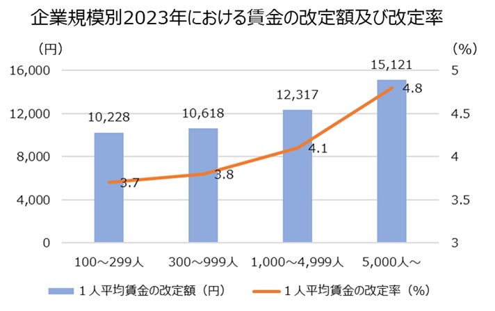 企業規模別に見ると、すべての規模において、昨年から1人あたり平均1万円以上の賃金が増加しています。また、企業規模が大きくなるにつれて賃金の改定額及び改定率も増加している事実が読み取れました。