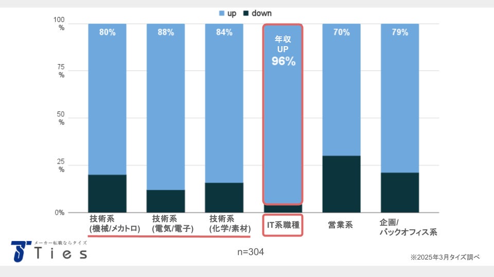 タイズは、メーカー業界に特化した転職エージェントとして、約1,300社の上場企業・大手メーカーへの紹介実績を持ちます。本調査では、製造業の主要職種である、技術系(機械、電気/電子、化学/素材)、IT系、営業系、企画/バックオフィス系の6職種を対象に、転職後の年収変動を分析しました。