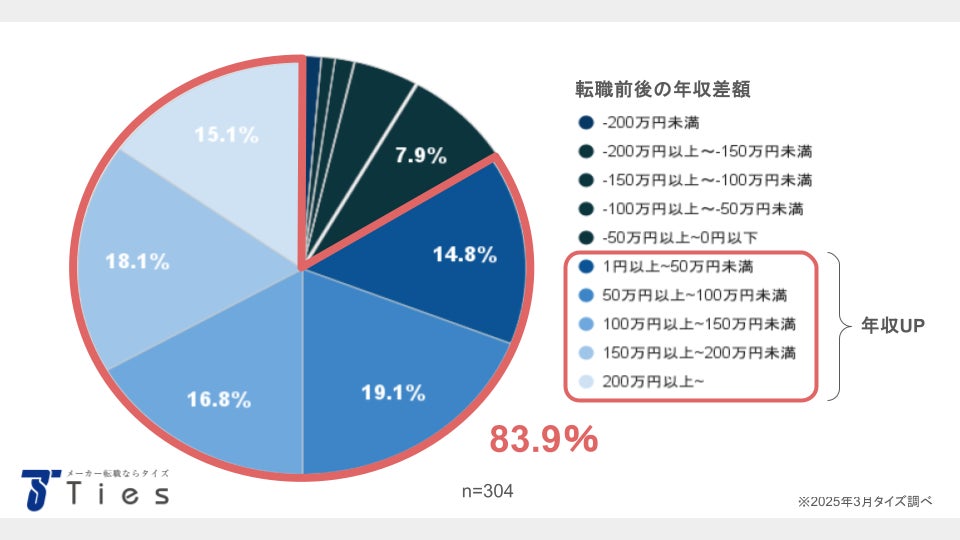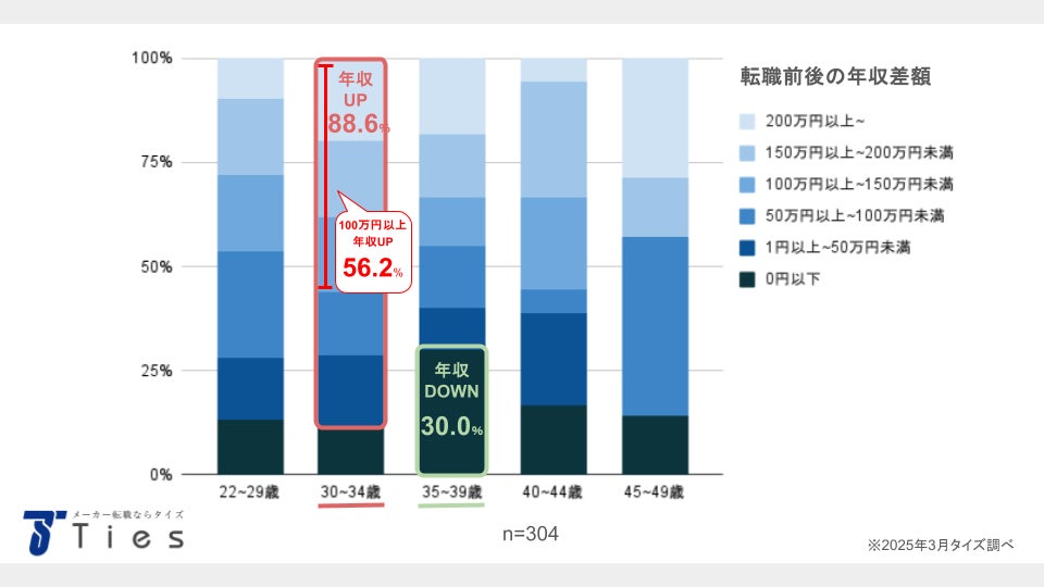 メーカー専門の転職エージェントである株式会社タイズ(本社:大阪府大阪市、代表取締役:今井 良祐、以下タイズ)は、2024年4月~12月の期間にタイズを利用し転職した20代~40代の男女304人を対象に、転職前後の年収変動を調査しました。本調査の結果を分析し、そのレポートを発表します。