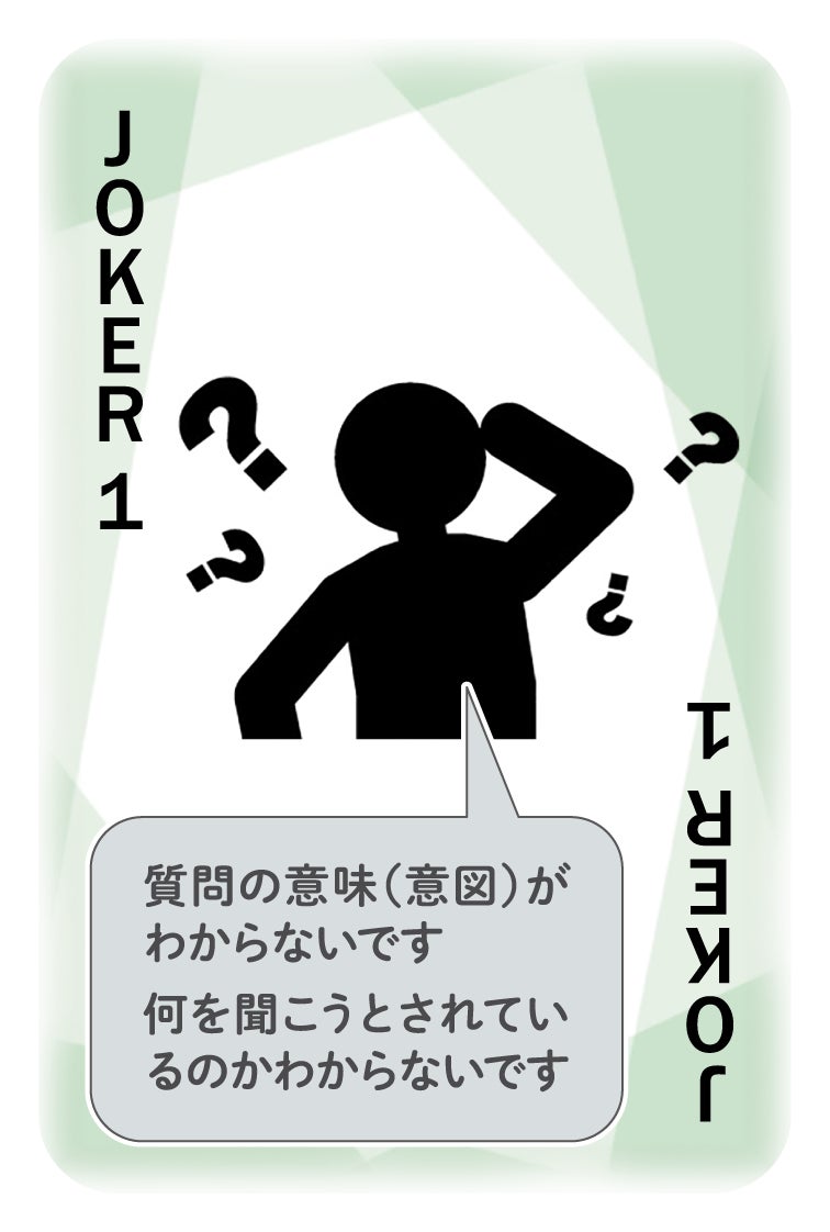 上司との面談で部下は自分の本音は言いづらいものです。質問の意味がわからず答えに窮してしまったり、答えづらい質問には答えたくないものです。そんな部下の気持ちを代弁するのがJokerです。コーチングトランプ®の中には部下の気持ちを代弁するJokerが10枚用意されており、上司の質問に答えたくない場合、部下は10枚の中からもっとも自分の気持ちに近いものを上司に提示することができます。そのことで上司は自分の質問が適切ではなかったと気づき、質問内容について考え直し、より効果的な質問をすることが可能となります。
