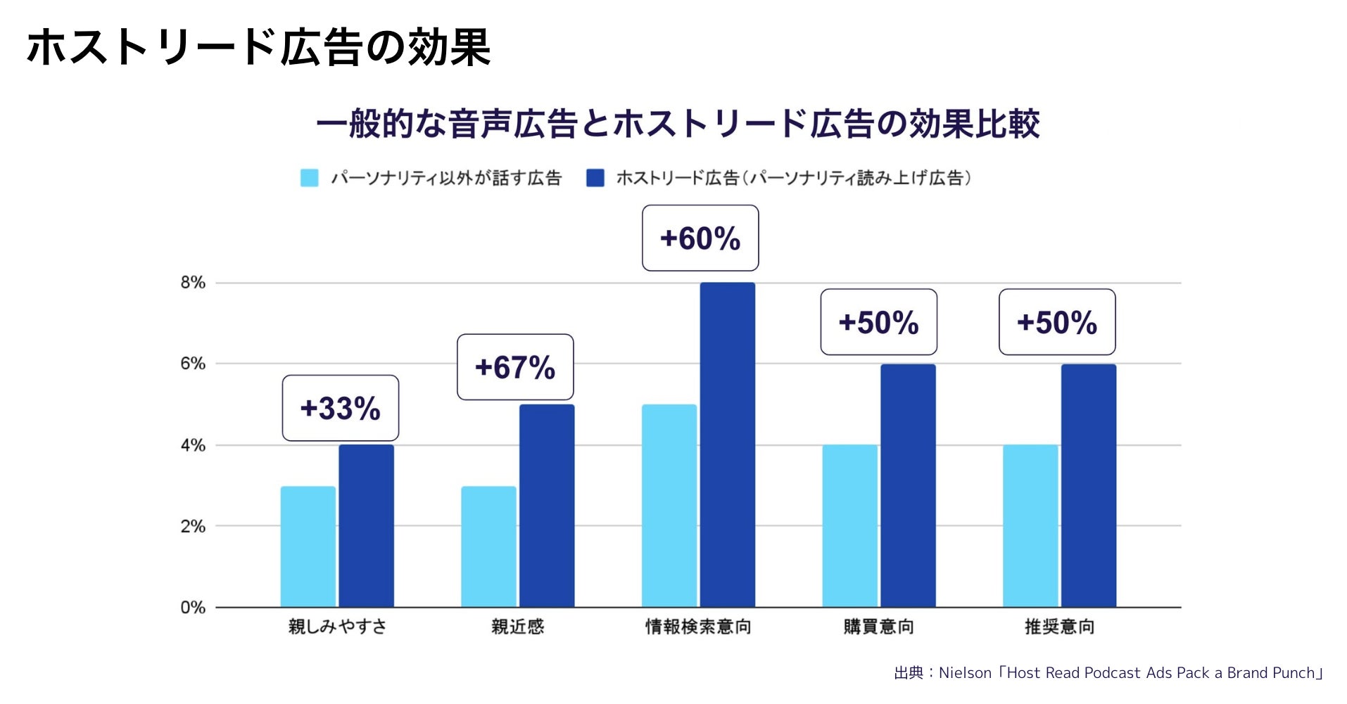 番組のパーソナリティが広告を読み上げる手法は「ホストリード広告」と呼ばれています。米国で行われた調査では、ホストリード広告はナレーター読み上げの音声広告と比較して、「情報検索意向が60%高い」「購買意向が50%高い」といったブランドリフト効果が出る***など、高いプロモーション効果が実証されています。