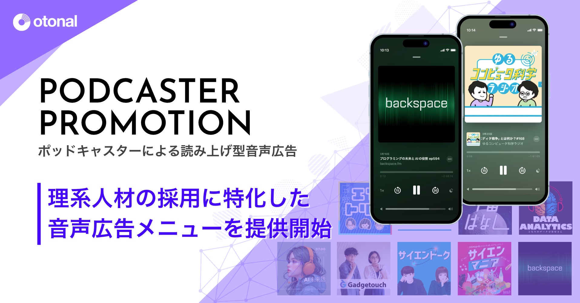 株式会社オトナル(本社:東京都中央区/代表取締役 八木太亮、以下、オトナル)は、ポッドキャスターによる読み上げ型音声広告サービス「PODCASTER PROMOTION(ポッドキャスタープロモーション)」の新メニューとして、理系人材の採用に特化した音声広告プランの提供を開始しました。
