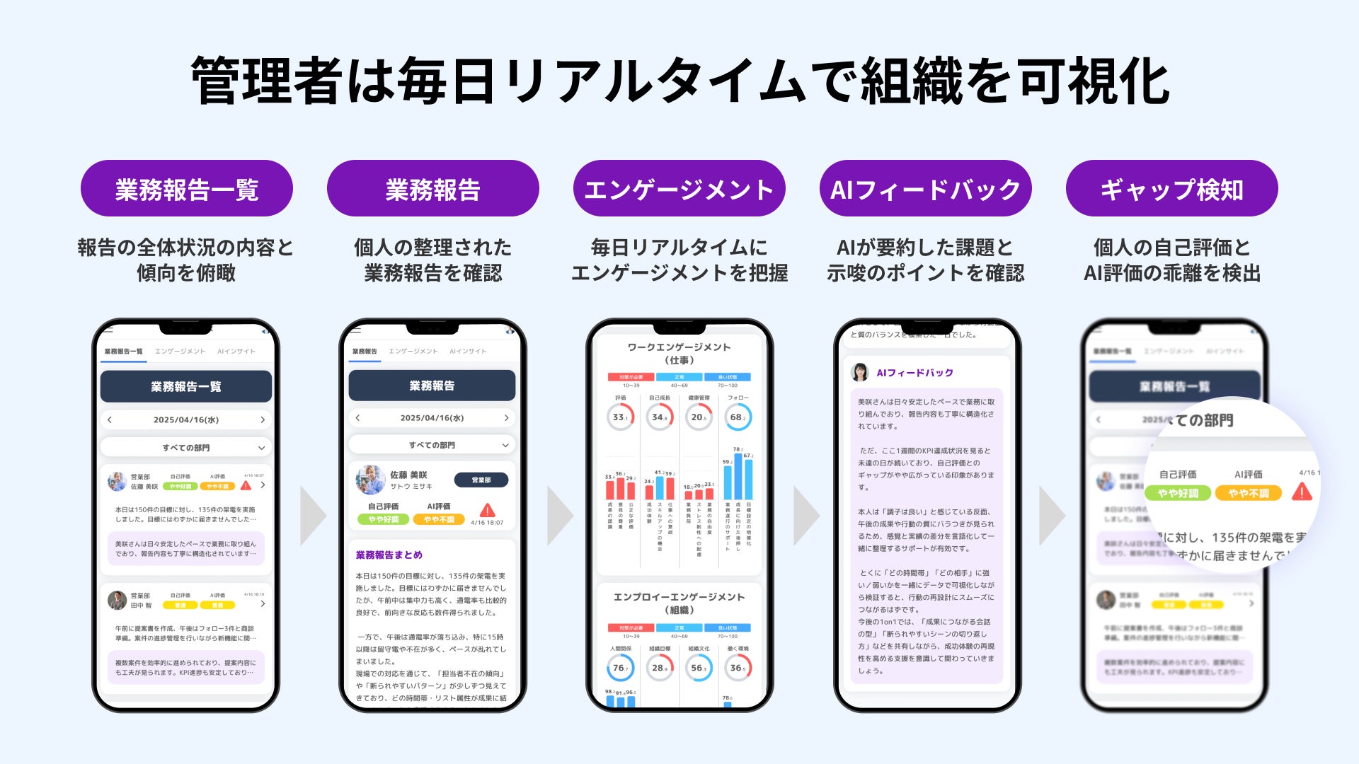 従業員は、AI との対話によって業務報告が自動化されると同時に、AI からフィードバックとして要点が整理されたまとめが提供されるため、自身の状態や行動を客観的に振り返ることができます。