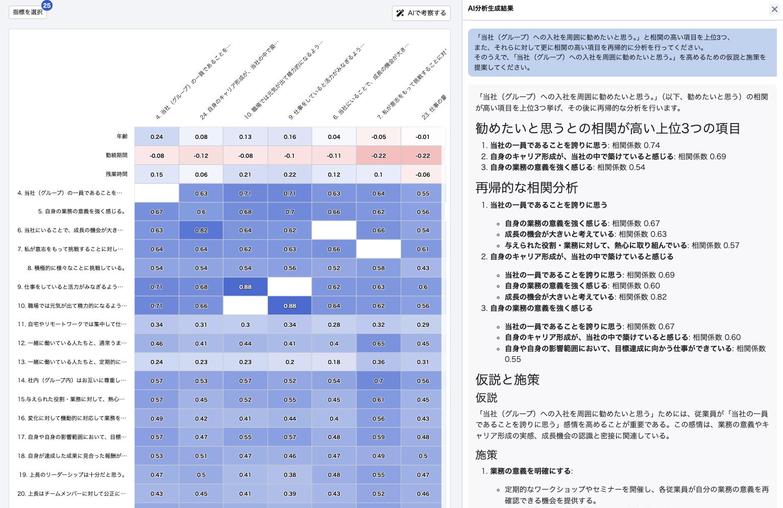 - 定性情報を考慮した深掘り分析質問:「営業部のデータに絞って分析してください。またマネージャーの人材育成スキルが低いという定性的な情報もあるので、そちらも考慮してください。」新機能の回答:営業部では、20代社員のサーベイ平均値と上長への評価に強い負の相関が見られます。具体的な施策として、若手向けのOJT制度の見直しや、マネージャー向けの1on1スキル研修の導入が考えられます。