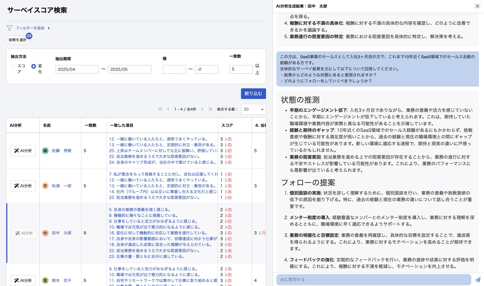 前回のサーベイと比較してスコアが変化した従業員(上昇・下降問わず)や、現時点でのスコアが特に低い(高い)従業員に対し、数多くの人事データをもとに、その傾向や状況をまとめ、説明します。スコアが低下した従業員に対しては、考えられる原因と具体的な改善アプローチ、上長や人事担当者の1on1や面談での質問項目まで提案します。従業員の職務内容や経歴といった追加情報を与えることで、個別最適化された分析が可能になります。