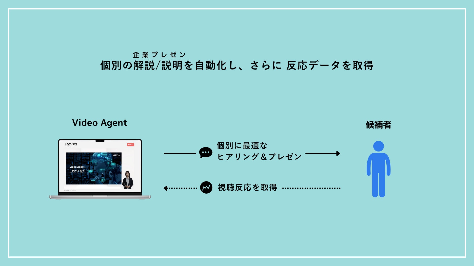 Video Agentは、AIを活用して“人が話す”ようなプレゼンテーションや解説を自動で行うソリューションです。営業資料の説明、カスタマーサポート、PR、IR活動、社員教育、オンボーディング、さらには採用活動まで、幅広い分野で活用可能です。