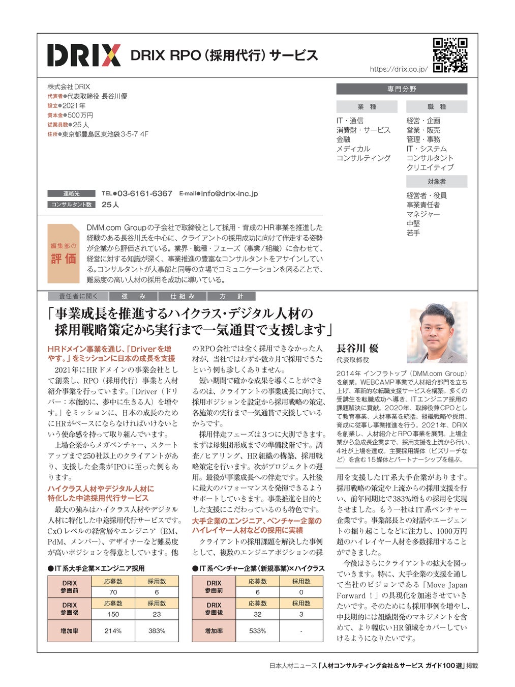 人事専門誌「日本人材ニュース」を発行する株式会社日本人材ニュース社(東京都千代田区、代表取締役:吉越利成)は、企業の人材採用を支援できる優れたコンサルティング会社とサービスを紹介する「人材コンサルティング会社&サービスガイド100選」に、RPOサービスのDRIXが参画したことをお知らせいたします。