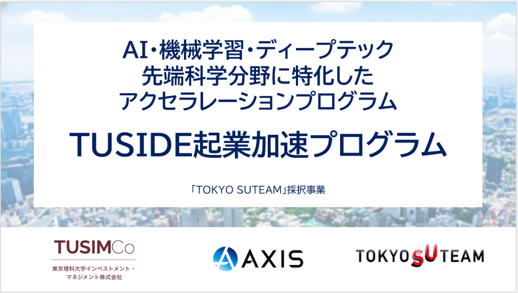 当社は、東京理科大学インベストメント・マネジメント株式会社(所在地:東京都新宿区/代表取締役社長:片寄 裕市)と連携し、東京都が実施する多様な主体によるスタートアップ支援展開事業「TOKYO SUTEAM」で採択されたAI・機械学習・ディープテック等の先端科学分野に特化したアクセラレーションプログラム「TUSIDE起業加速プログラム(通称:TUSIDE EAP)」を実施します。