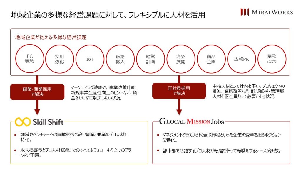 当社は、副業マッチングサービス『Skill Shift』(https://www.skill-shift.com/)と、地方転職マッチングプラットフォーム『Glocal Mission Jobs(GMJ)』(https://glocalmissionjobs.jp/)を運営し、地方中小企業が都市部の優秀な人材を経営幹部や後継者として、正社員採用、または副業採用をするための支援を行っています。