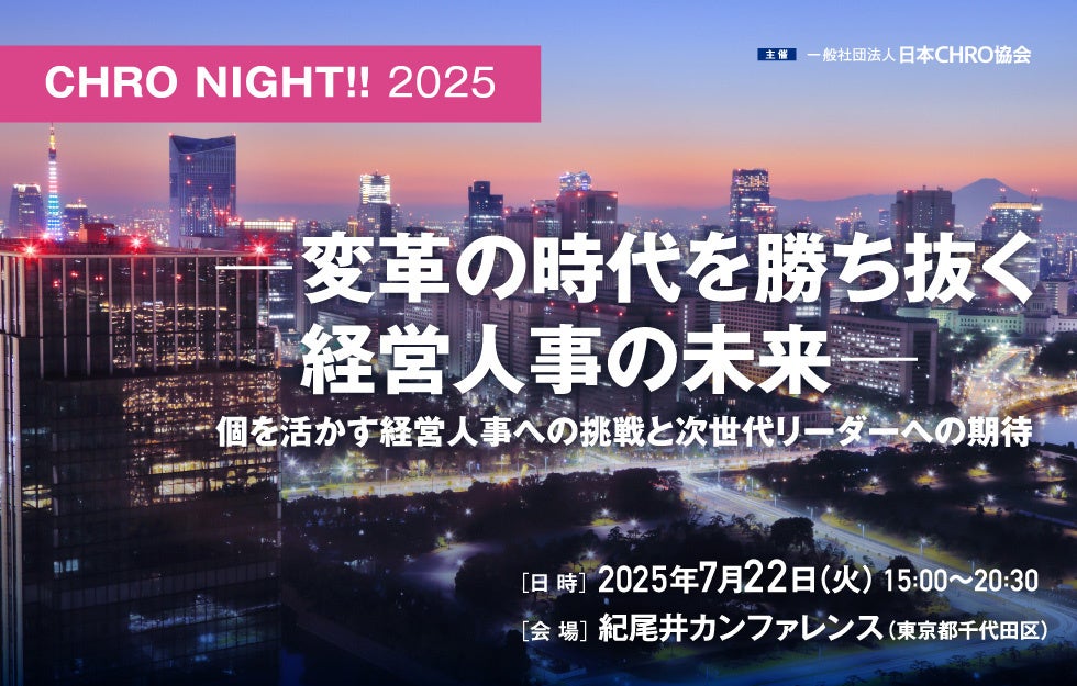一般社団法人日本CHRO協会(東京都千代田区、理事長:中井戸 信英、以下日本CHRO協会)は、7月22日に、CHRO NIGHT!! 2025『―変革の時代を勝ち抜く経営人事の未来― 個を活かす経営人事への挑戦と次世代リーダーへの期待』を開催します。